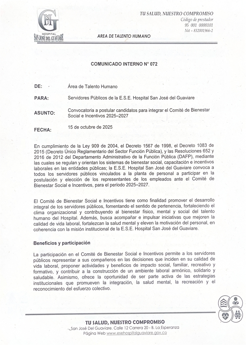 La E.S.E. Hospital San José del Guaviare informa a todos los servidores públicos que, mediante el Comunicado Interno N.º 076, se publica el listado oficial de servidores inscritos a la convocatoria del Comité de Bienestar Social e Incentivos, correspondiente al periodo 2025–2027.